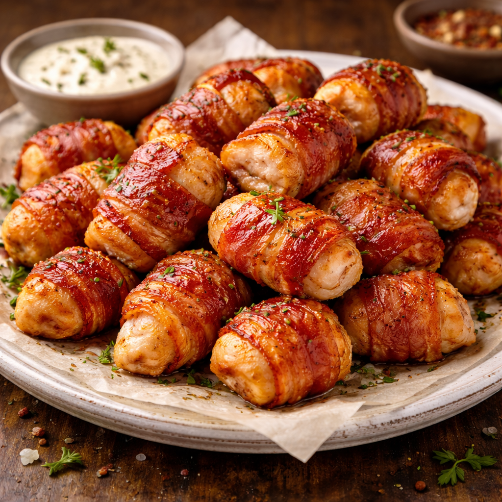 Crispy bacon wrapped chicken bites served on a platter with dipping sauce